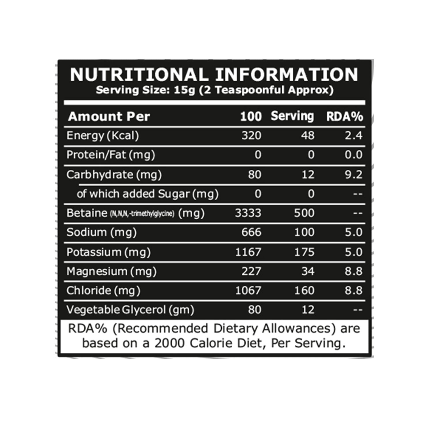 Betaine Anhydrous, Magnesium Sulphate, Potassium Chloride, Trisodium Citrate, Glycerol.