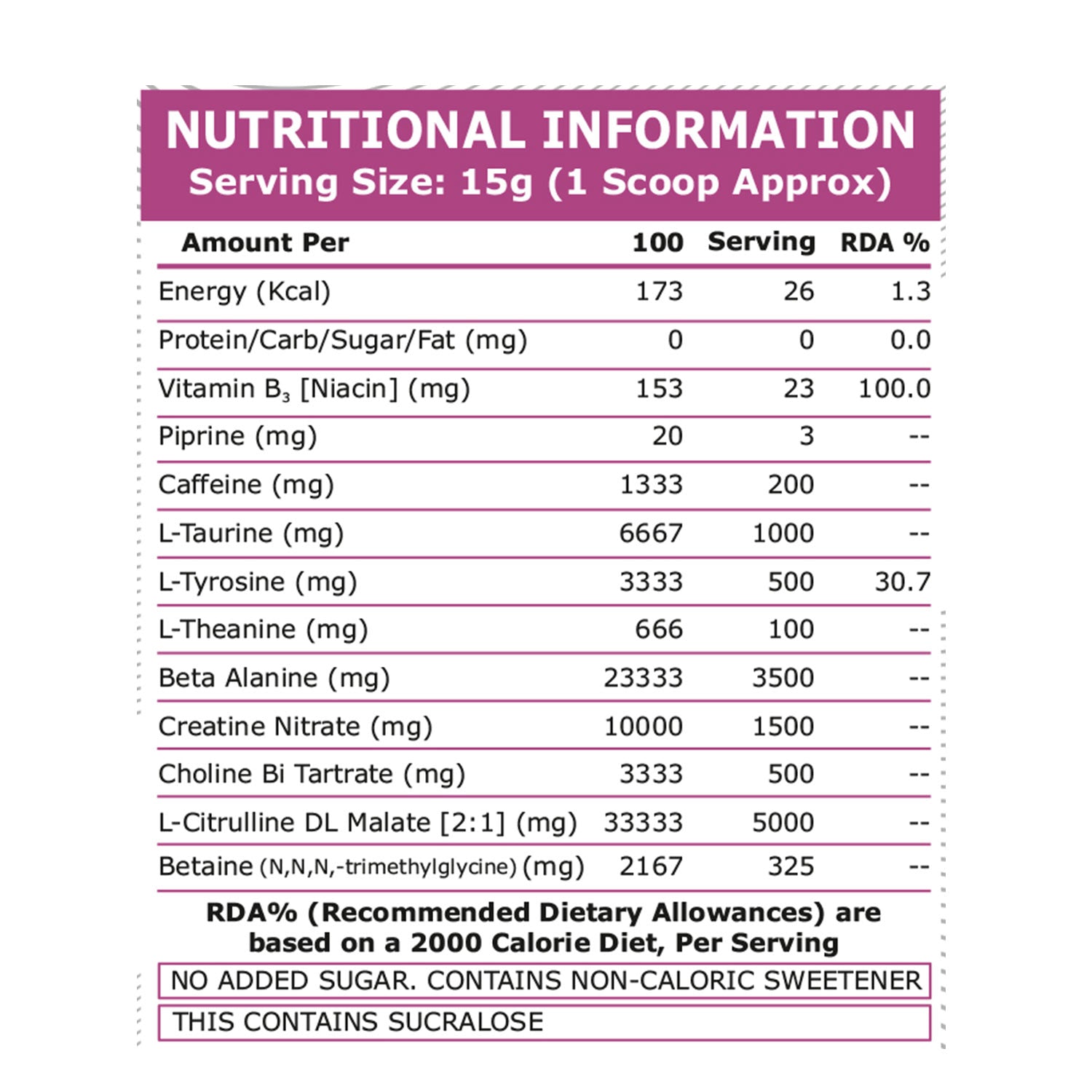 Serving Size 15g (1 Scoop Approx). For best results consume 1 serving 5-10 minutes prior to exercise/workout session with approximately 100-150ml of water or as directed by your trainer/health care professional. The recommended maximum daily dosage is 1 serving for adults. Depending on the conditions being addressed, like body/weight/age/nutritional need etc., dosage can be varied. Always check with your trainer/health care professional for the right dosage.